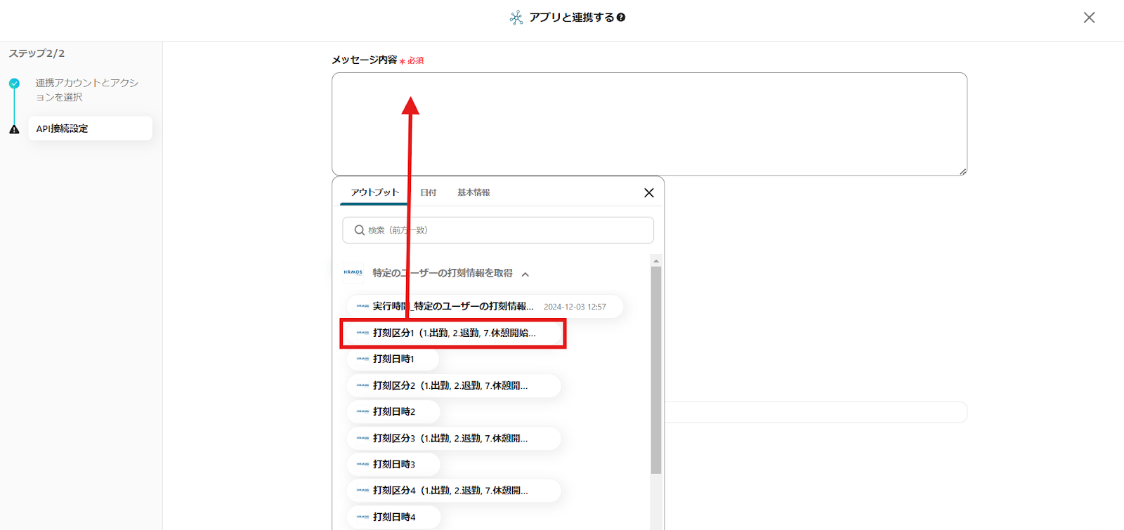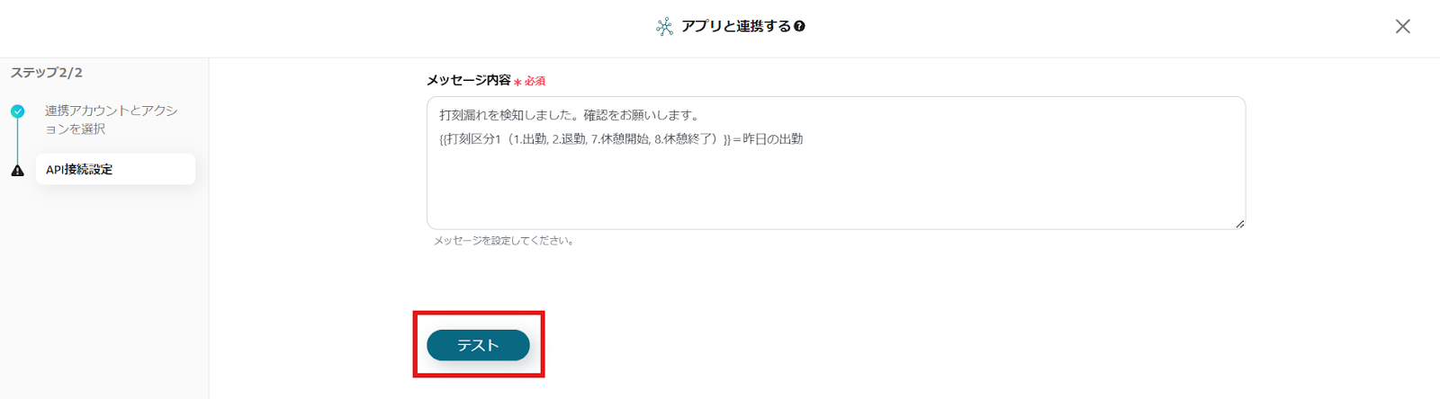 今回は「打刻区分1=出勤」が空になっているデータがある場合にTelegramへメッセージが送信される設定となっています。