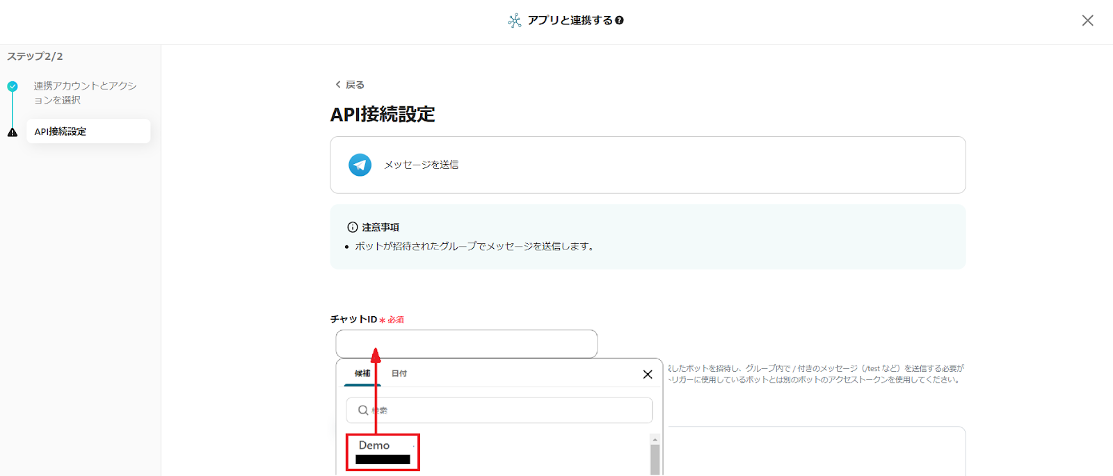続けてTelegramに投稿するメッセージを設定します。ボックスをクリックしましょう。