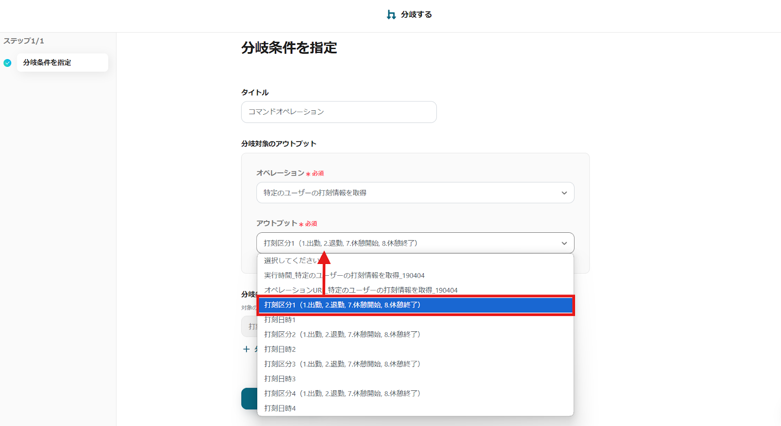 今回は「打刻区分1=出勤」の打刻漏れを通知するため、等しいデータを選択しました。