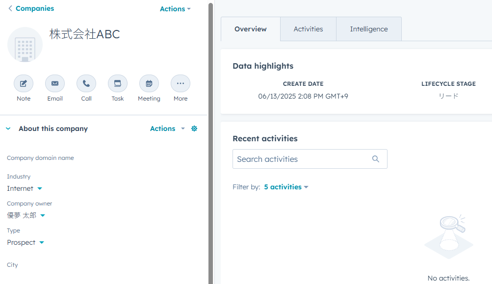 フローの作成を始める前に、あらかじめYoomと連携するHubSpotに、新しい会社を登録しておきましょう!