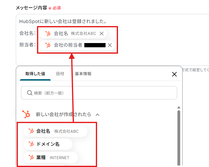 「メッセージ内容」は、入力欄をクリックして表示される取得した値から選択してください。