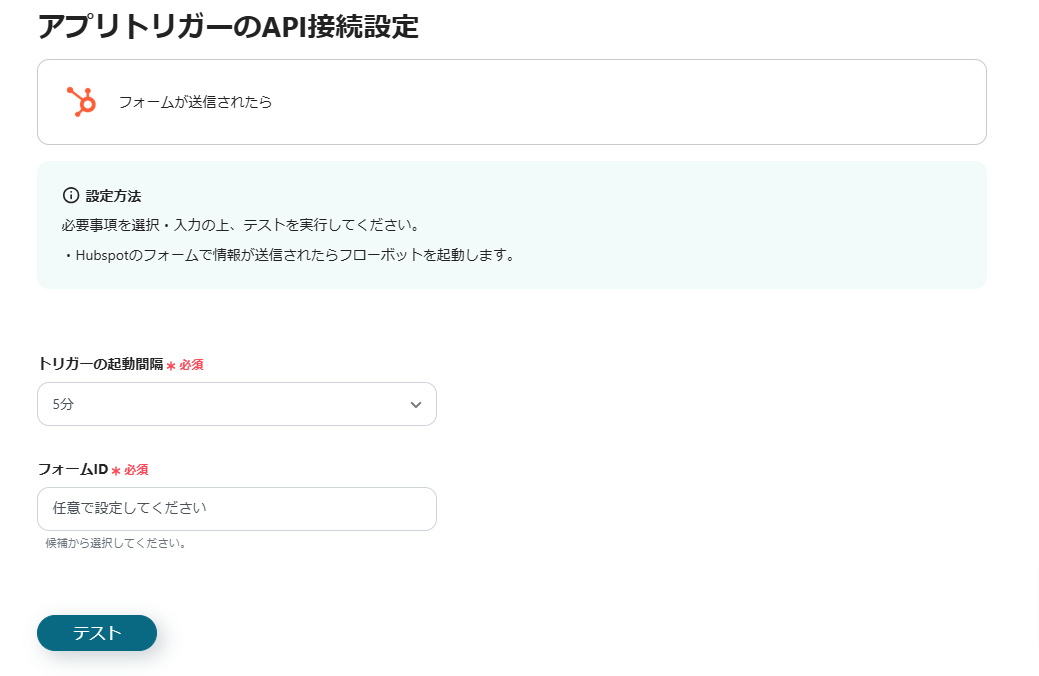 フォームIDを候補から選択したら、指定したフォームでテスト用に値を入力した後に「テスト」をクリックしてください。