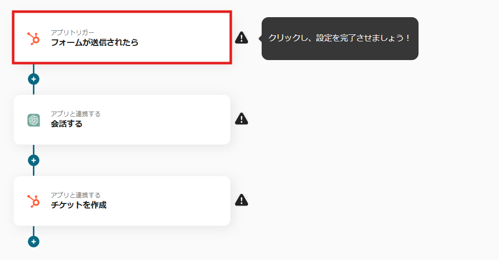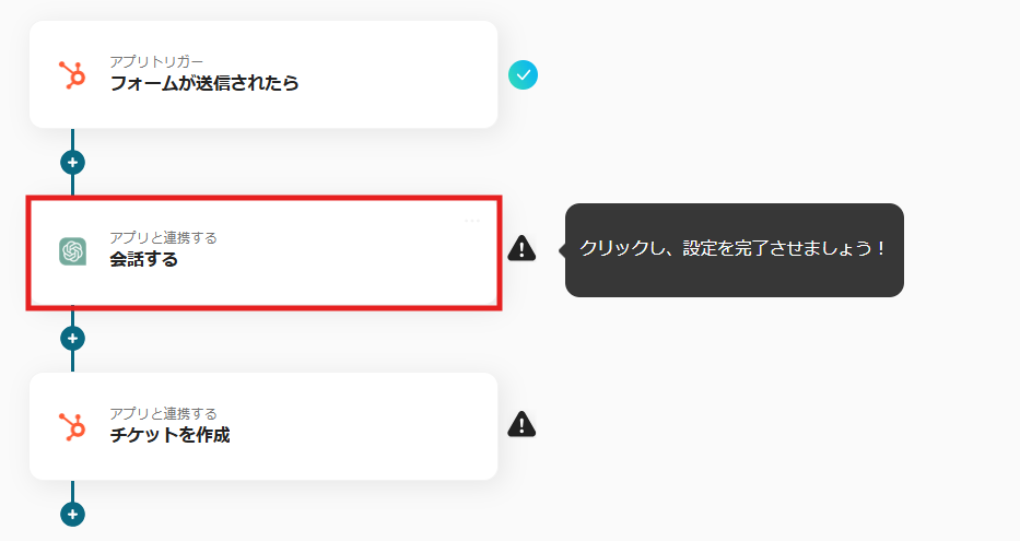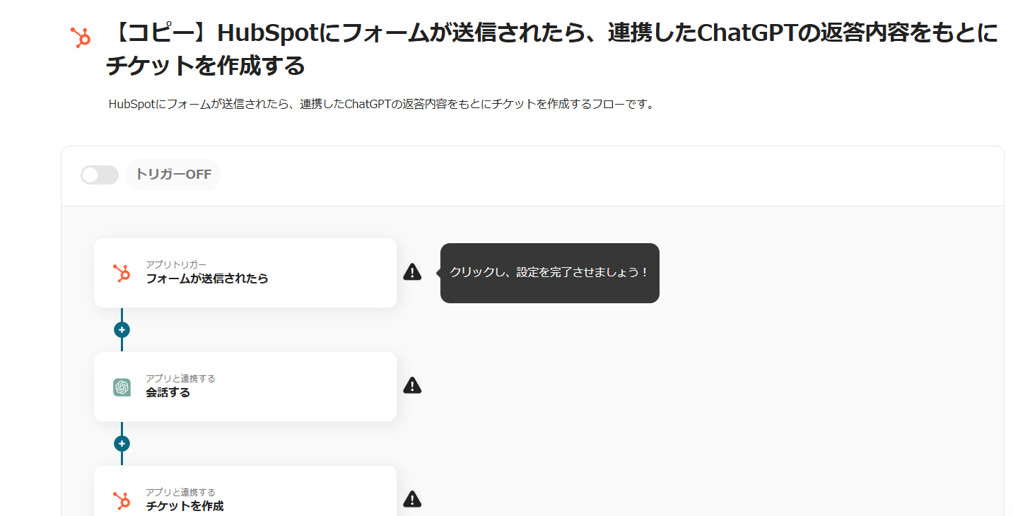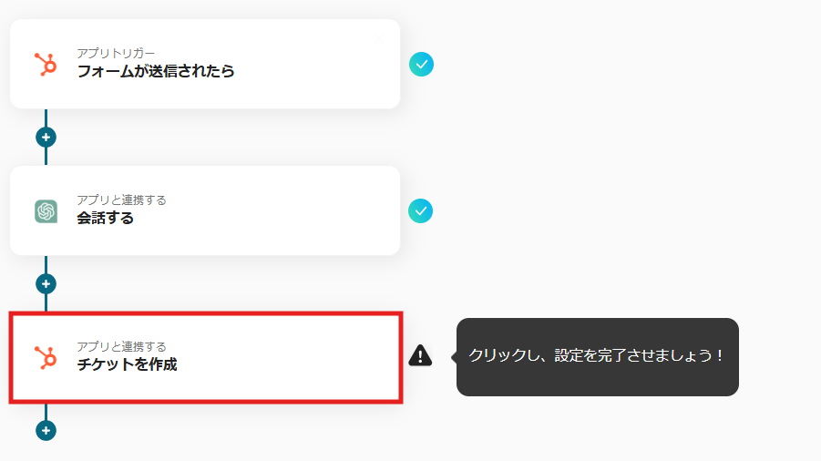これで【HubSpotにフォームが送信されたら、連携したChatGPTの返答内容をもとにチケットを作成する】というフローが完成です。