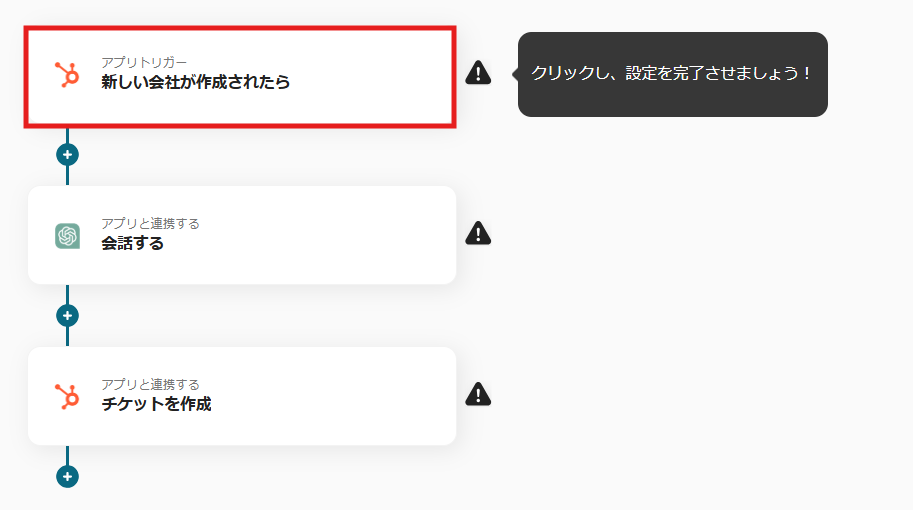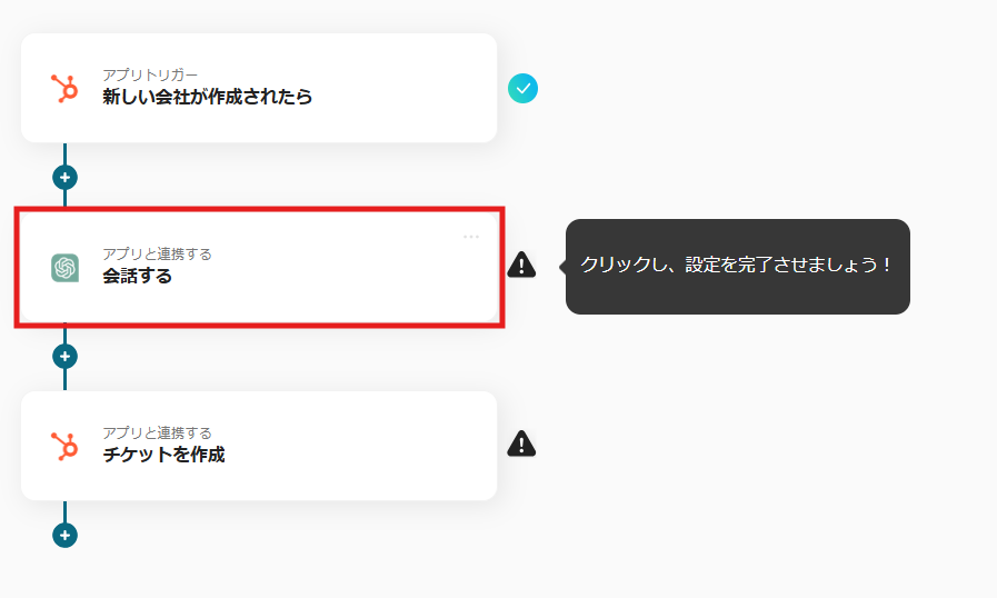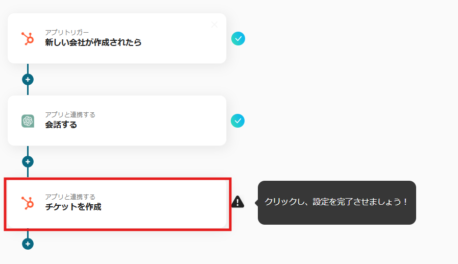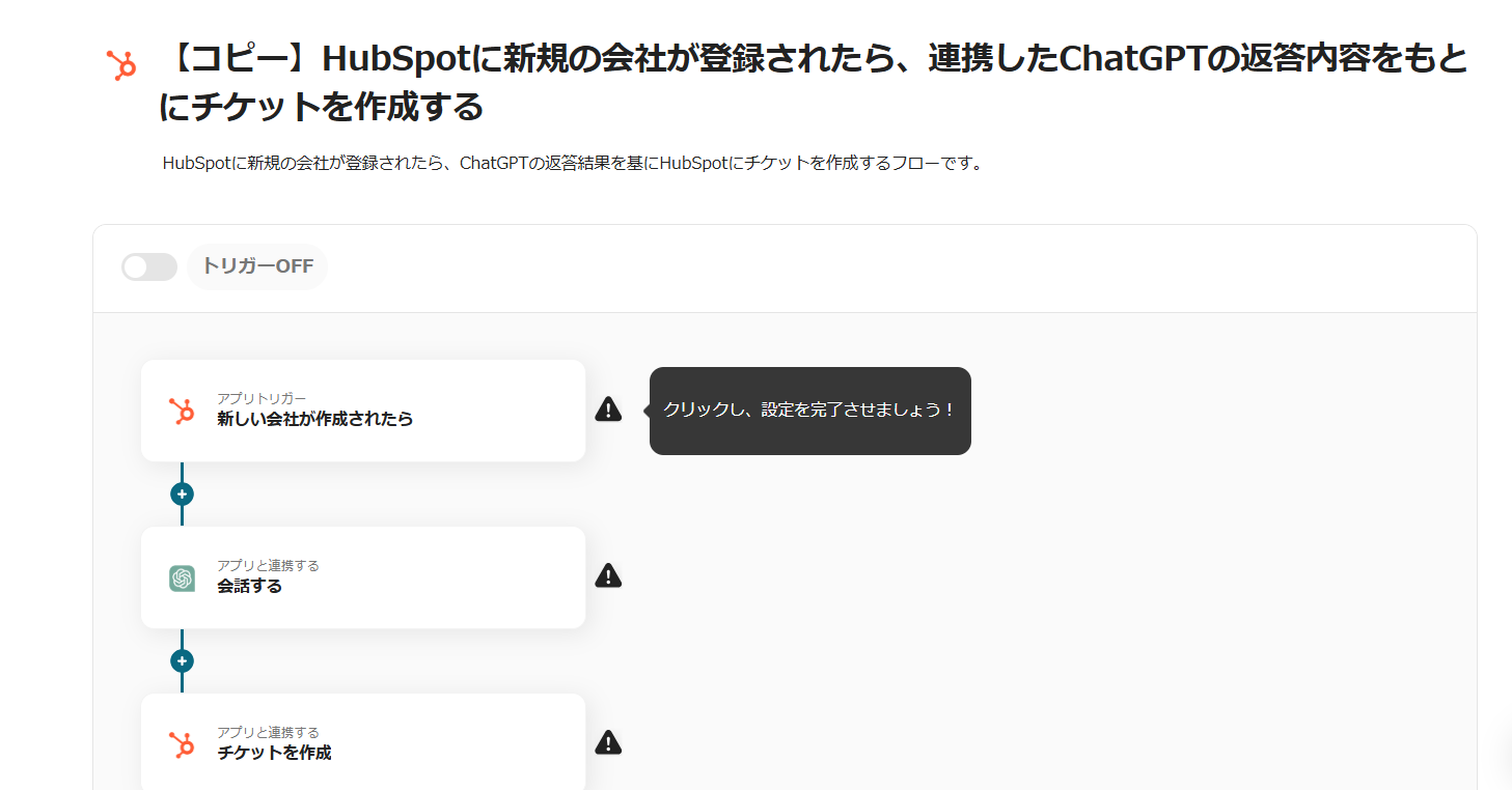 これで【HubSpotに新規の会社が登録されたら、連携したChatGPTの返答内容をもとにチケットを作成する】というフローが完成です。
