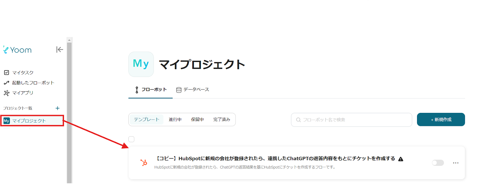 ここからは、Yoomのテンプレート【HubSpotに新規の会社が登録されたら、連携したChatGPTの返答内容をもとにチケットを作成する】という連携フローを使って設定の解説をします。