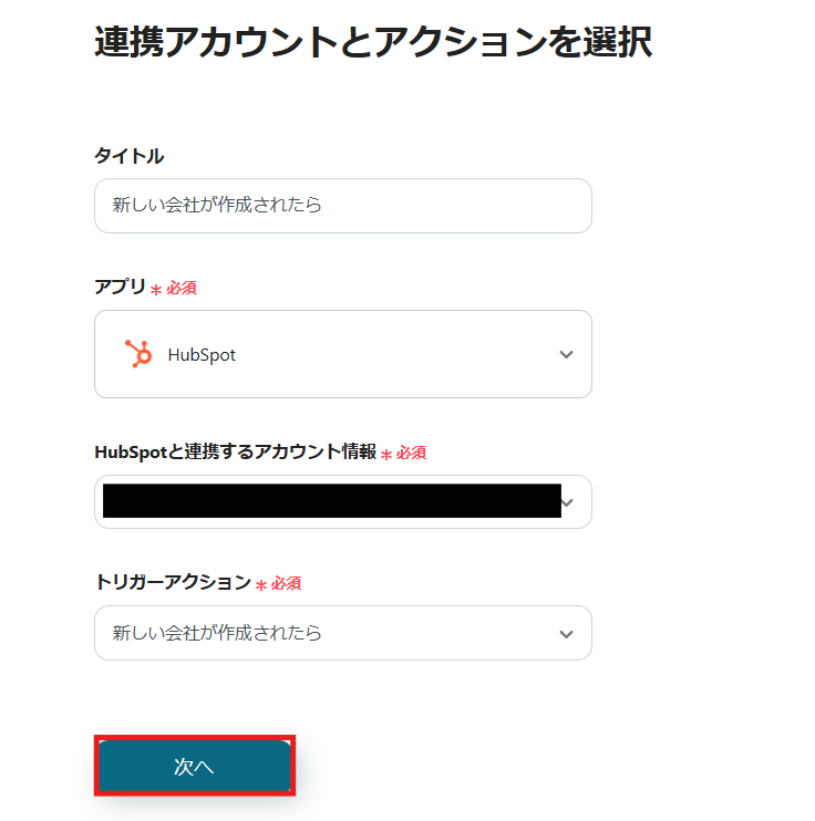 1) アクションは「新しい会社が作成されたら」を選択して、「次へ」をクリックします。