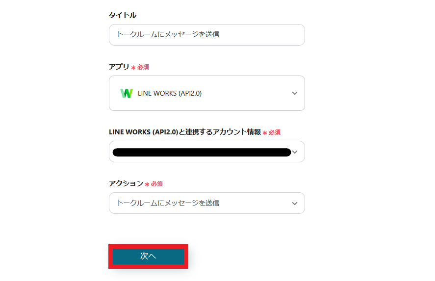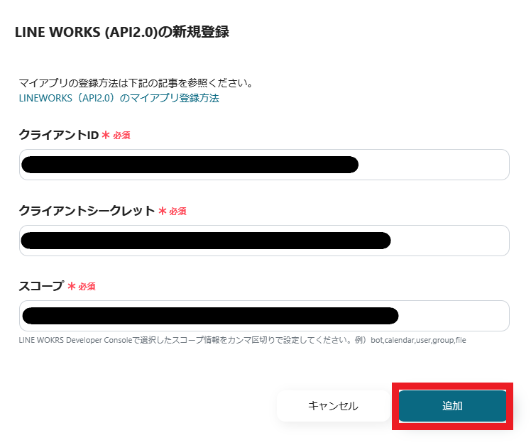 2.LINE WORKSと連携するアカウント情報を入力します。