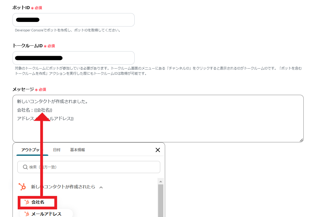 ボットIDは候補から、トークルームIDはアウトプットから選択してください。