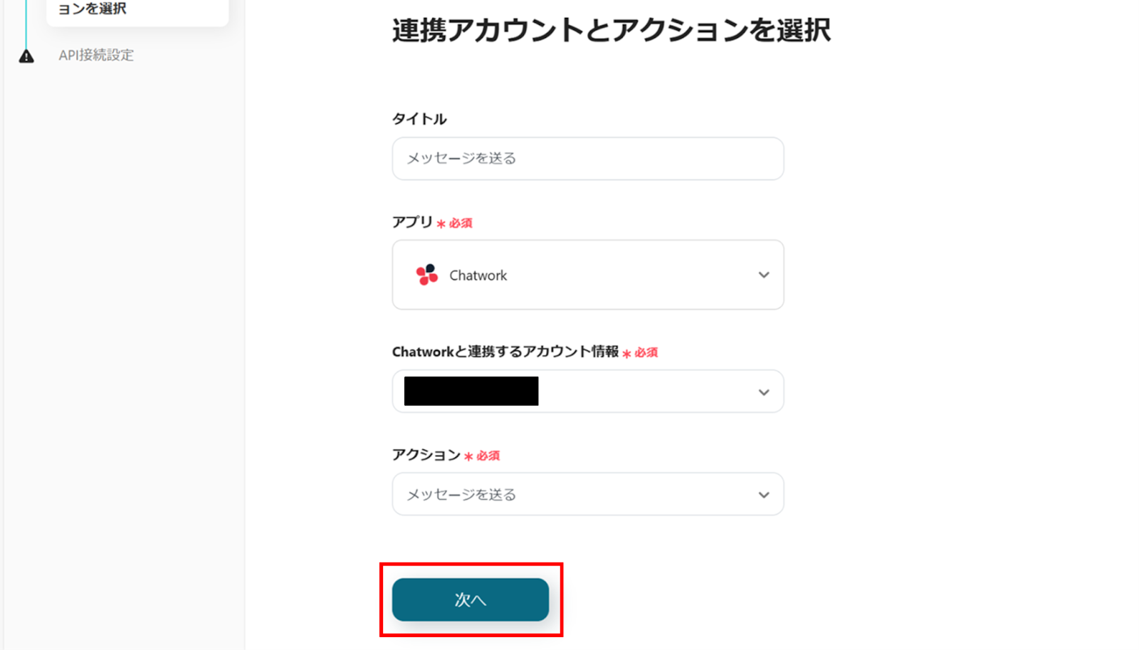 (2)Chatworkの「連携アカウントとアクションを選択」画面から、Chatworkと連携するアカウント情報に誤りがないかを確認し、アクションは「メッセージを送る」のままで「次へ」をクリックします。