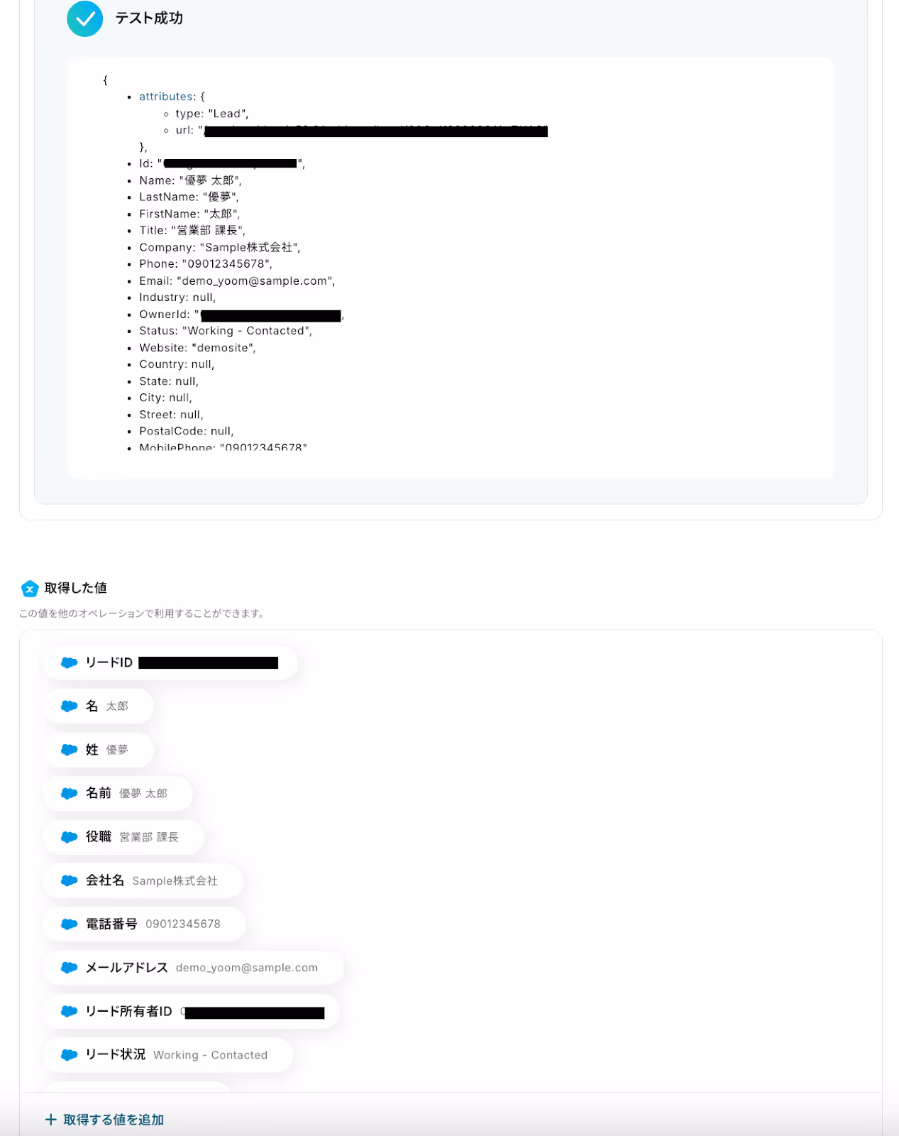 テストが成功すると、先ほど登録したリードの情報が「取得した値」に抽出されるので、内容を確認しましょう。
