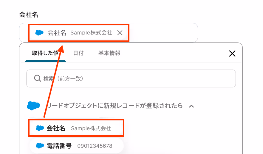 たとえば、「会社名」には「リードオブジェクトに新規レコードが登録されたら」内にある、「会社名」を設定します。