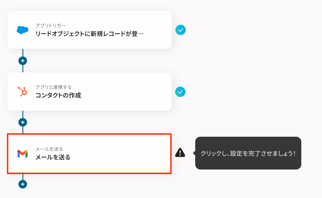 続いて、HubSpotにコンタクトが作成された旨を、Gmailを使って通知する設定を行います。