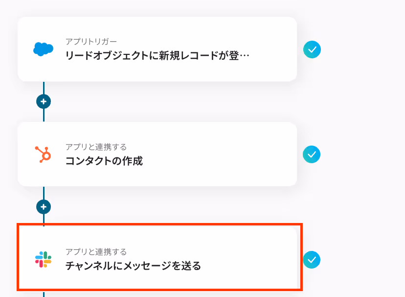 このように「取得した値」を用いて設定することで、Salesforceに作成されたリード情報をそのまま引用し、HubSpotにコンタクトを作成できるようになります。