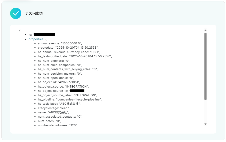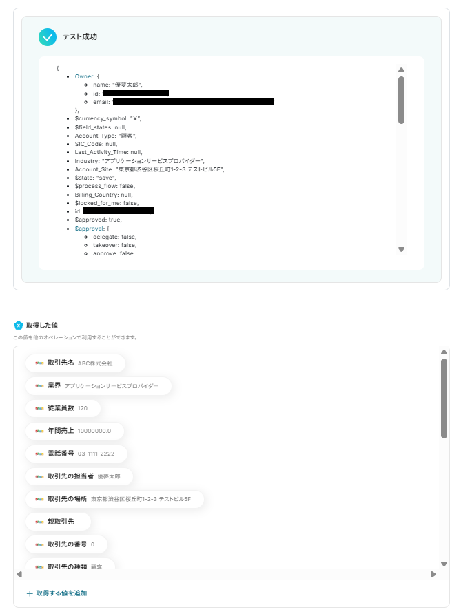 テストが成功すると、下記のような取得した値が表示され、先ほど作成した取引先が確認できます。