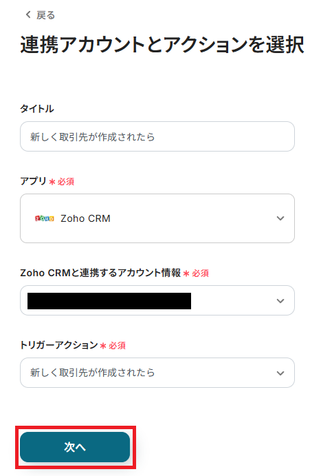 Zoho CRMと連携するアカウントに間違いがないかを確認し、「次へ」をクリックしましょう。