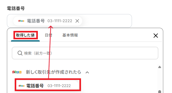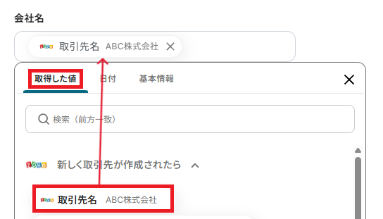 「会社名」は、取得した値を活用し設定しましょう。