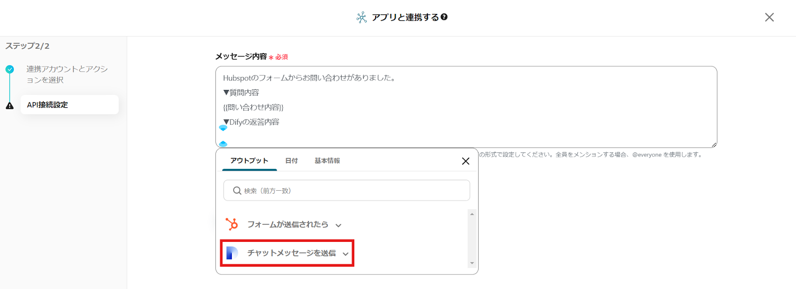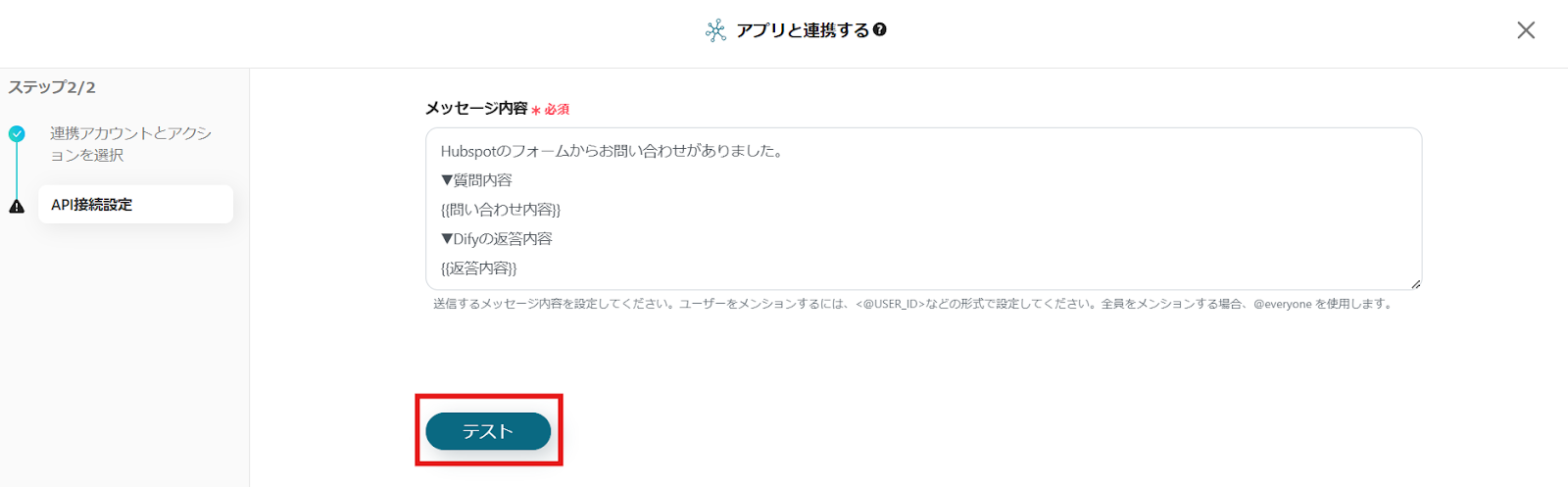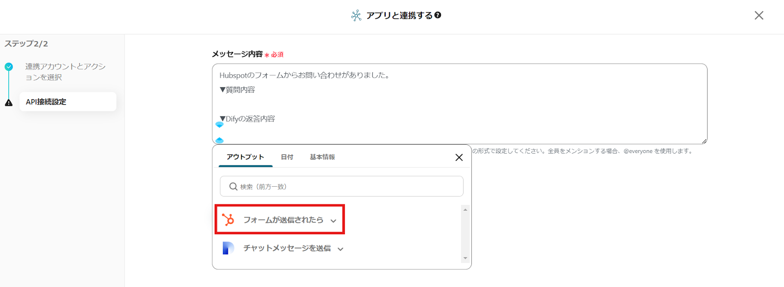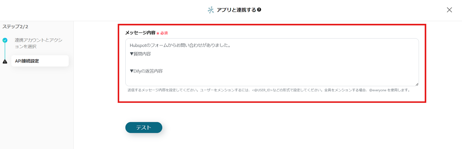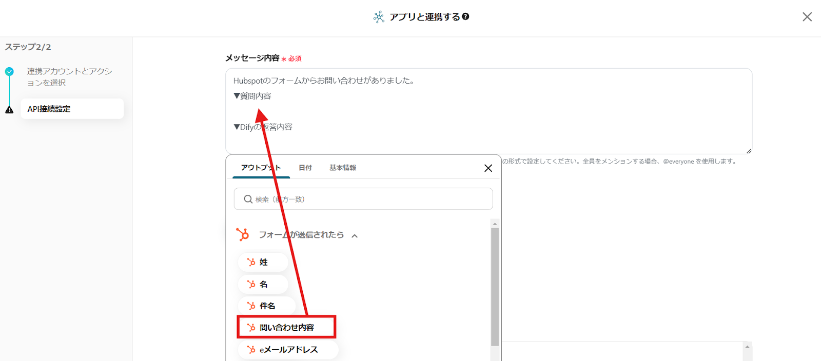 HubSpotのデータが選択できるため、質問内容の下に「問い合わせ内容」に等しいデータをクリックで挿入してください。