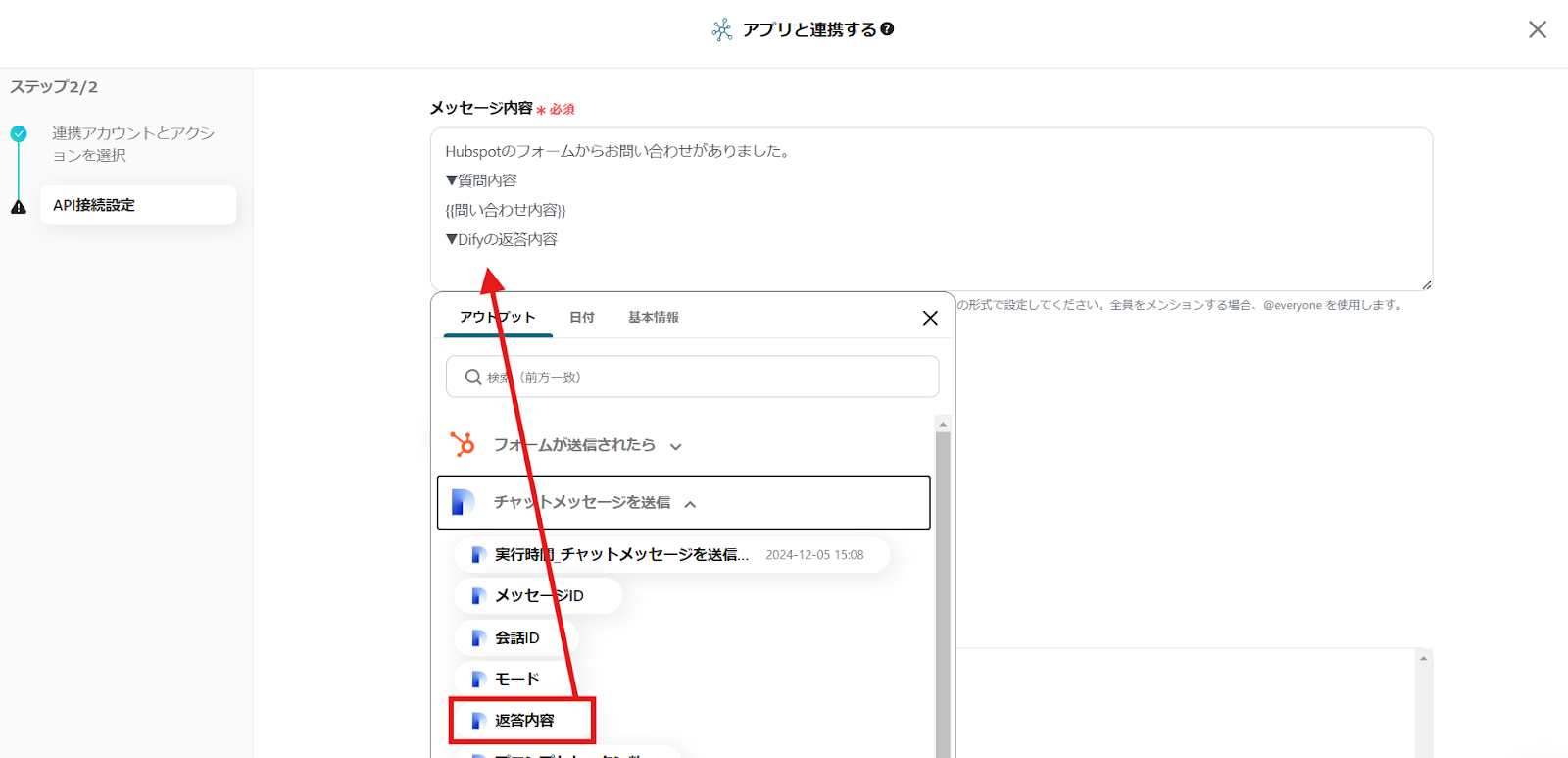 Difyの返答内容の下に「返答内容」をクリックで挿入してください。