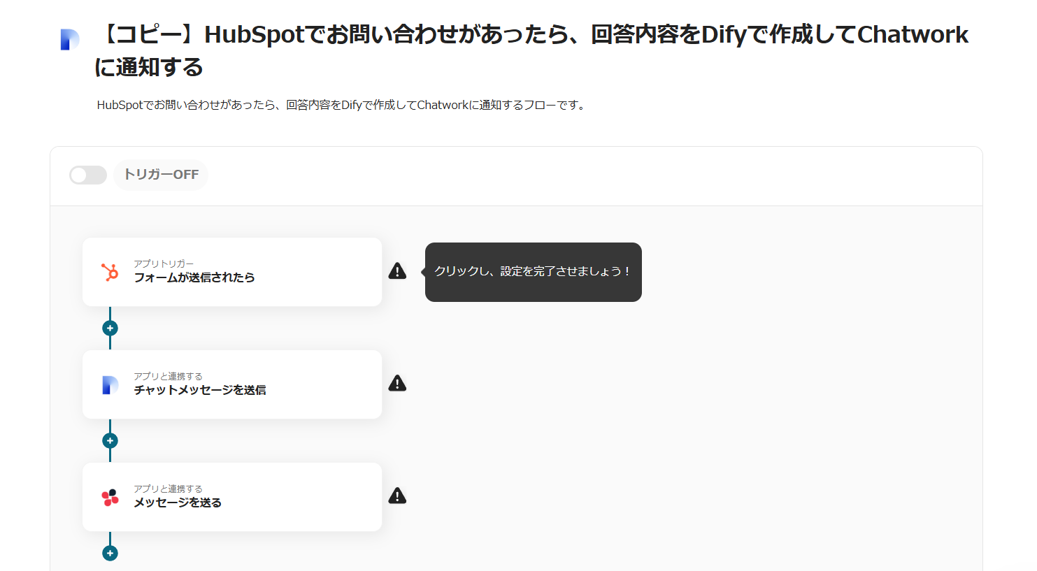 今回は「HubSpotでお問い合わせがあったら、回答内容をDifyで作成してDiscordに通知する」という自動化を、下記のテンプレートを用いて行います。