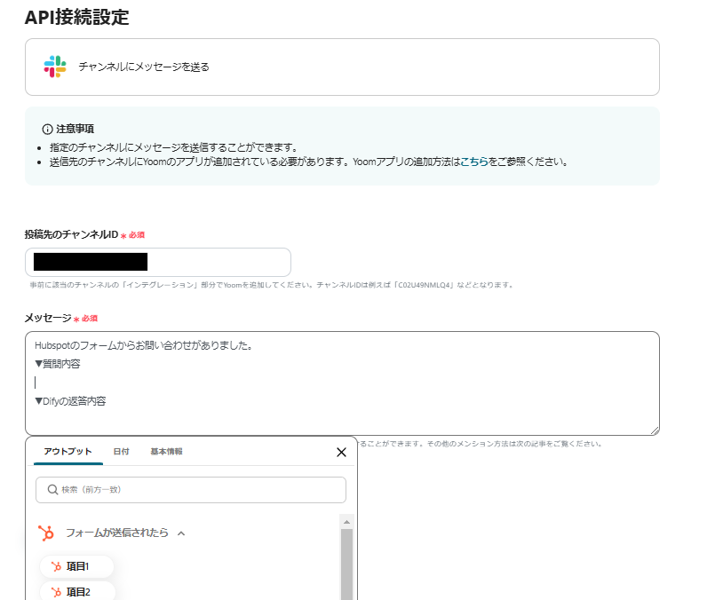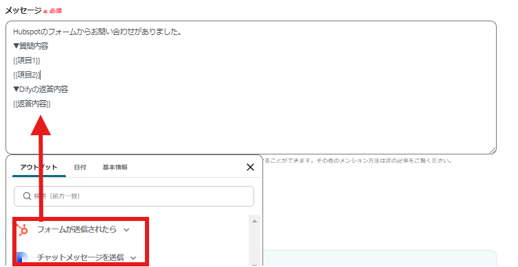 ステップ4:DifyのHubSpotのメッセージを送信する設定