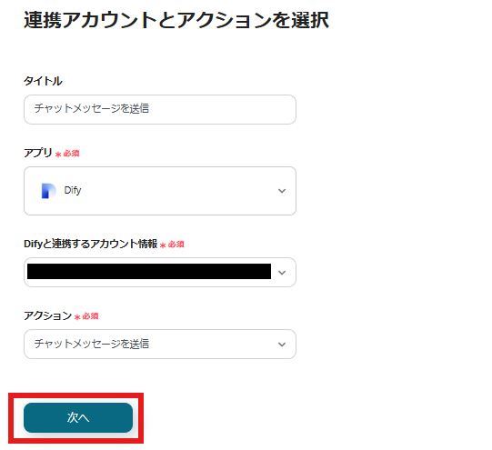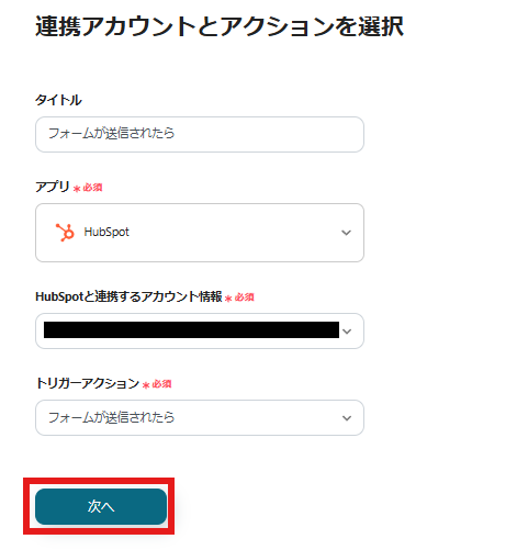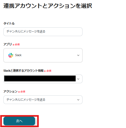 「連携アカウントとアクションを選択」の画面が表示されるので、「次へ」をクリックします。
