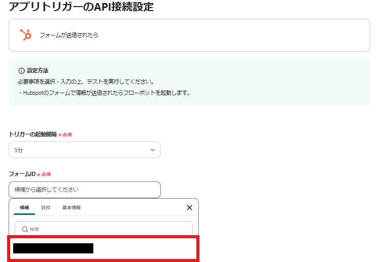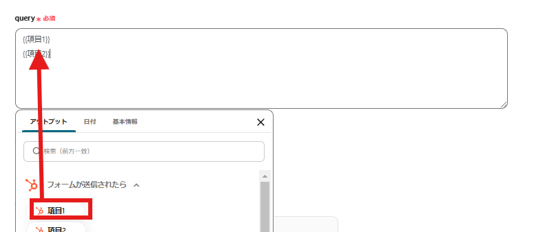 フォームIDの箇所をクリックすると、「アウトプット」が表示されるので、候補から任意のフォームIDを選択しましょう。