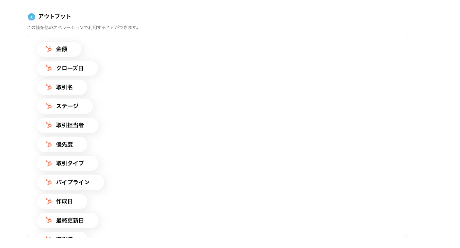 アウトプット情報は、「この値を他のオペレーションで利用することができます。」という注釈の通り、この後のステップで引用・活用できます。