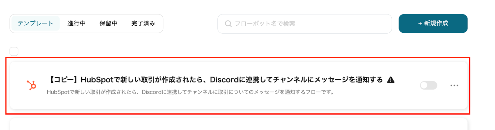 では、「HubSpotで新しい取引が作成されたら、Discordに連携してチャンネルにメッセージを通知する」のテンプレートを使ったフローボットを作成していきましょう。