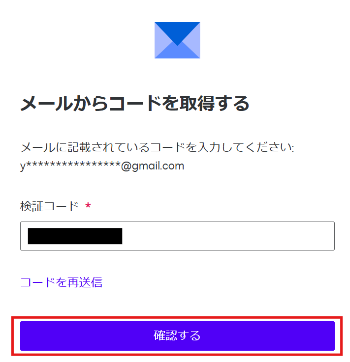 以下の画面で、コードを入力し、「確認する」をクリックしてください。