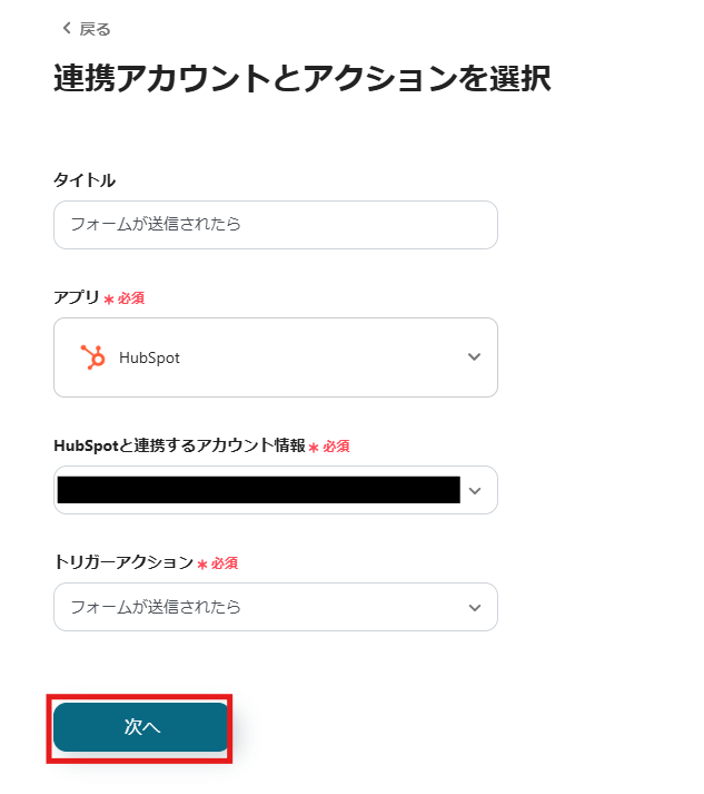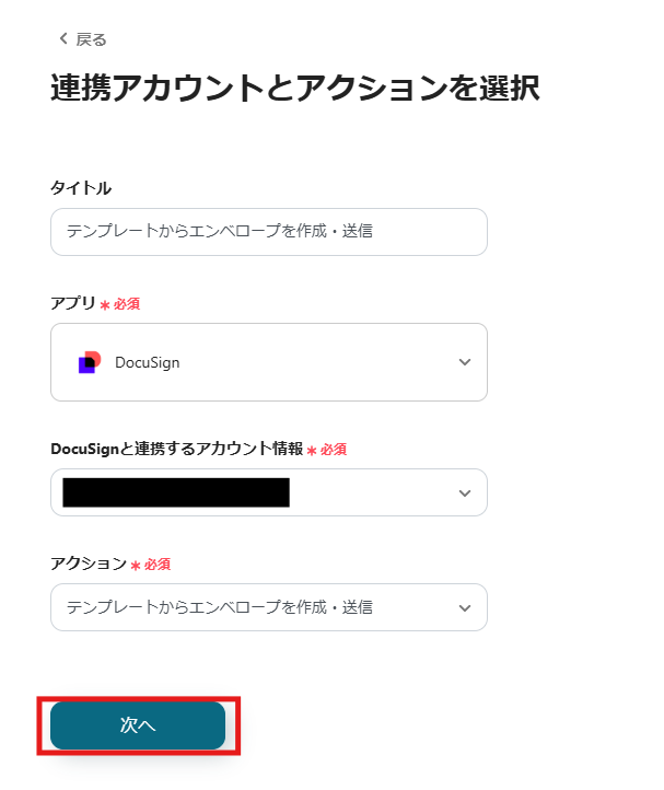 表示された画面で必須項目を入力し、「次へ」をクリックします。