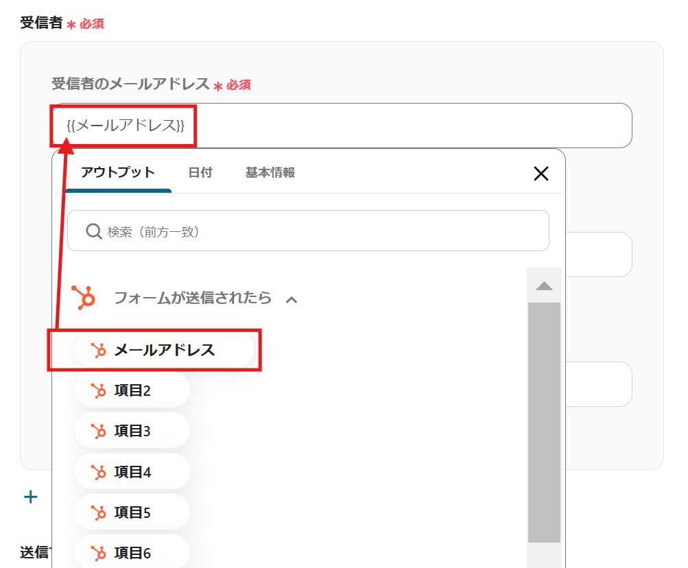 「受信者」の各項目は、入力欄をクリックして表示されるアウトプットから選択できます。