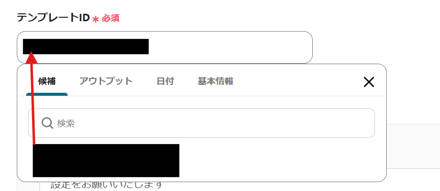 「テンプレートID」は、入力欄をクリックして表示される候補から選択してください。