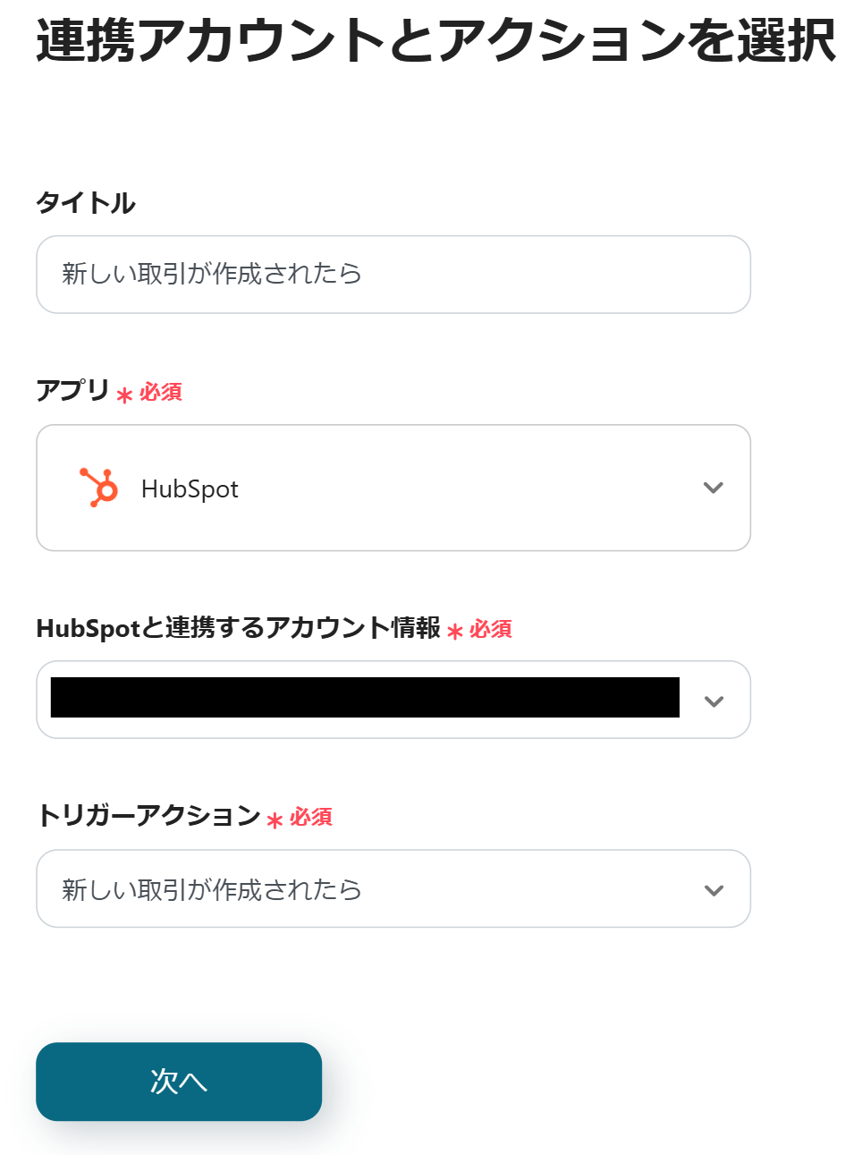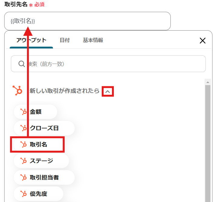 ※HubSpotの取引名に取引先名を登録している想定で設定を行っています。