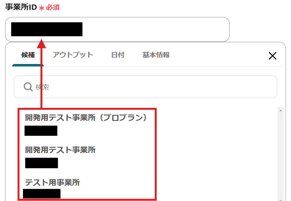 以下の画面が表示されたら、「事業所ID」から候補から選択してください。