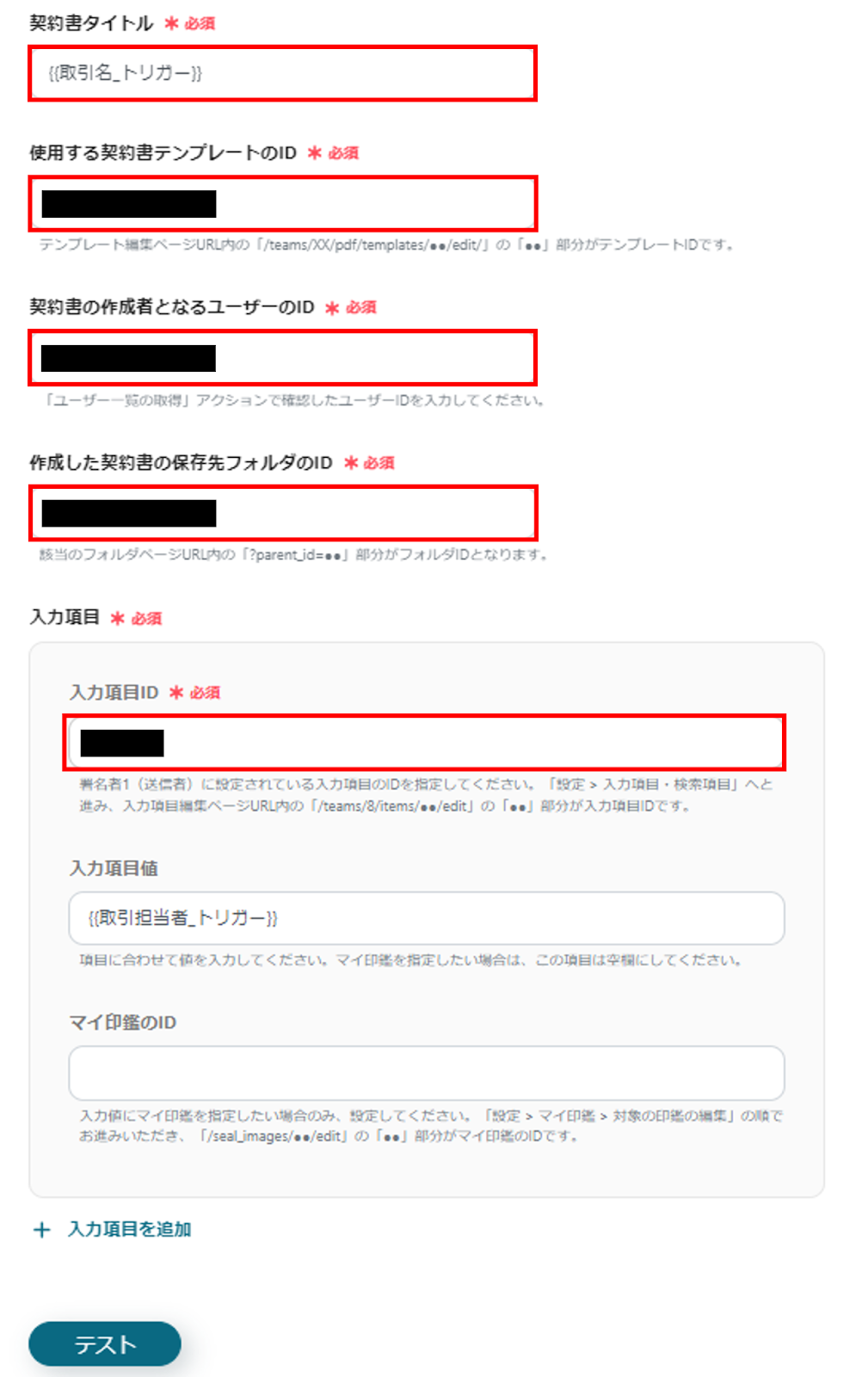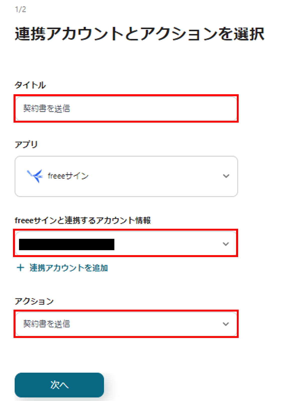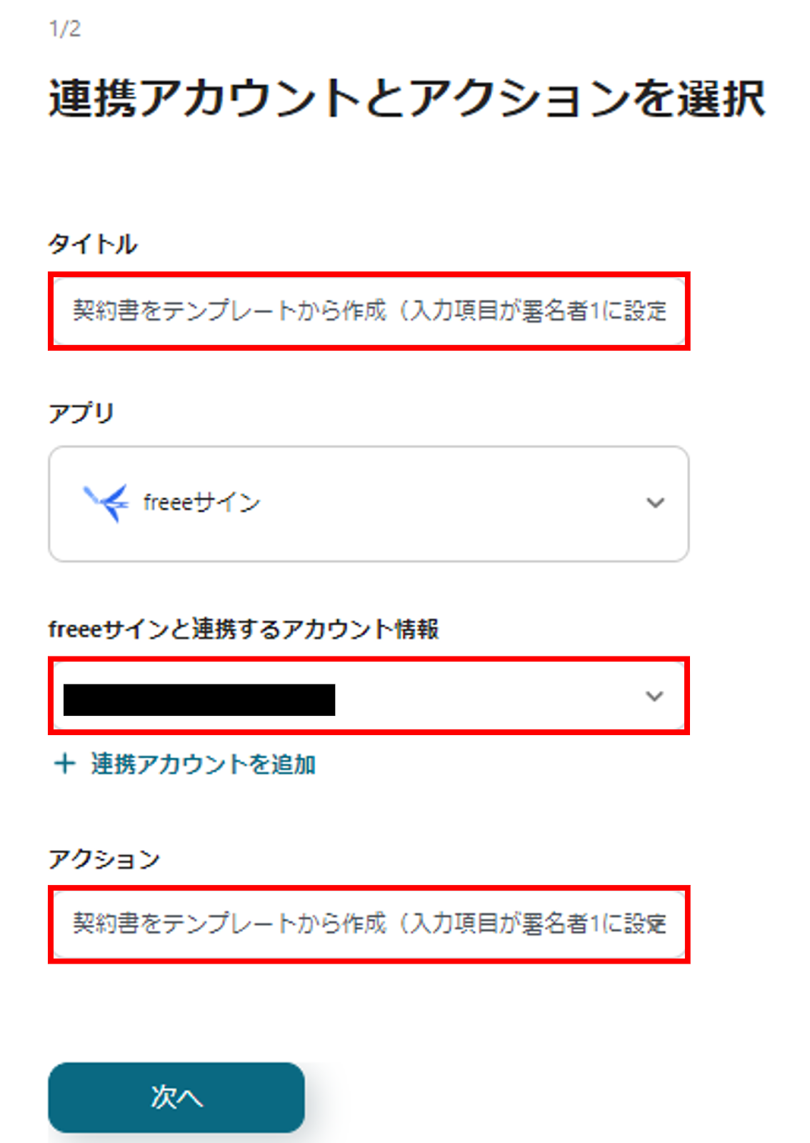 (4)アクションは「契約書をテンプレートから作成(入力項目が署名者1に設定されている)」を選択