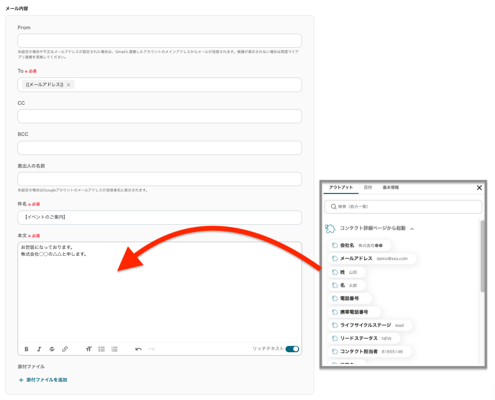 「本文」も同様に欄をクリックし、表示されたアウトプットデータから定型メールに追加したい項目を任意で選択することができます。
