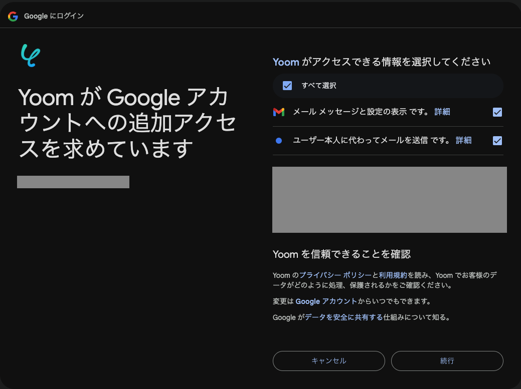 「Yoom がアクセスできる情報を選択してください」の下にあるチェックボックスをクリックし、画面右下の「続行」をクリックしてください。