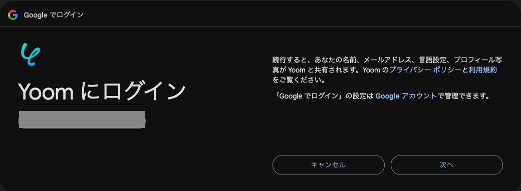 「Yoom にログイン」が表示されたら「次へ」をクリックします。