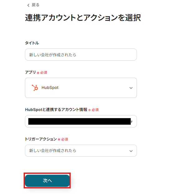 2.表示された画面で必須項目を入力します。トリガーアクションはそのままにして、「次へ」をクリックしましょう。