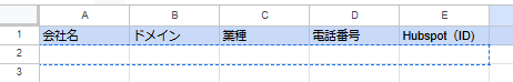 HubSpotの情報を格納するため、指定の列名を保持したスプレッドシートを事前に用意します。