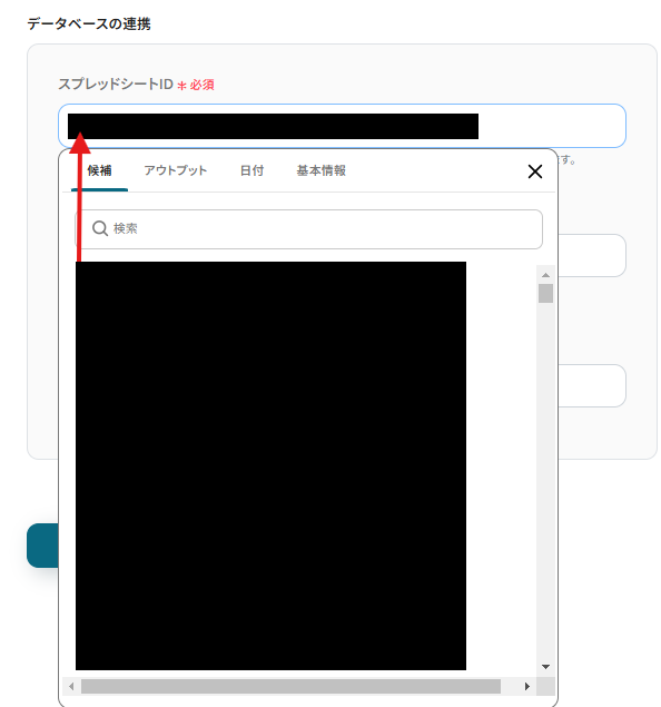 「スプレッドシートID」「スプレッドシートのタブ名」は、入力欄をクリックして表示される候補から選択するか、入力欄下の説明に従って、入力してください。