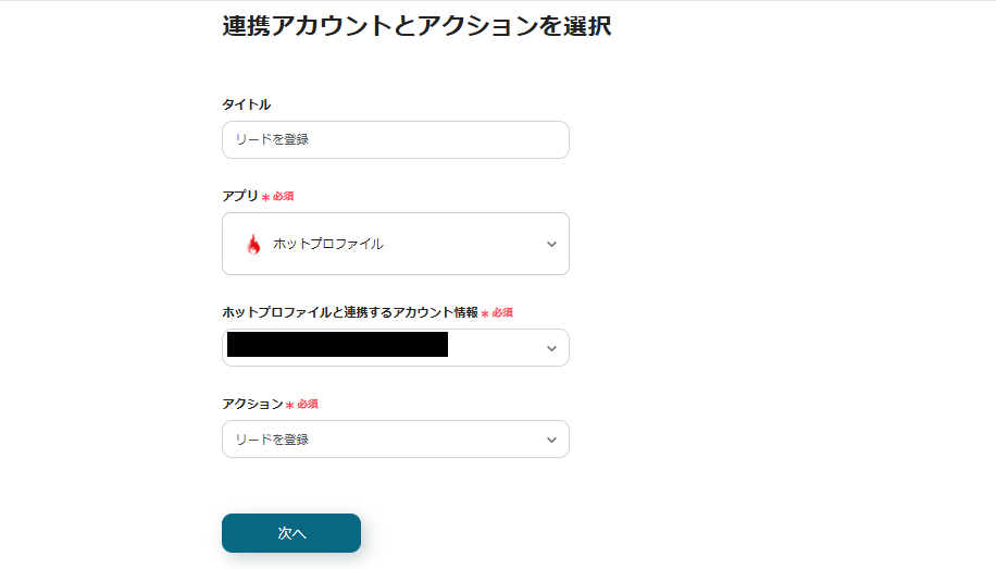 アクションが「リードを登録」と選択されているのを確認して、次に進みます。