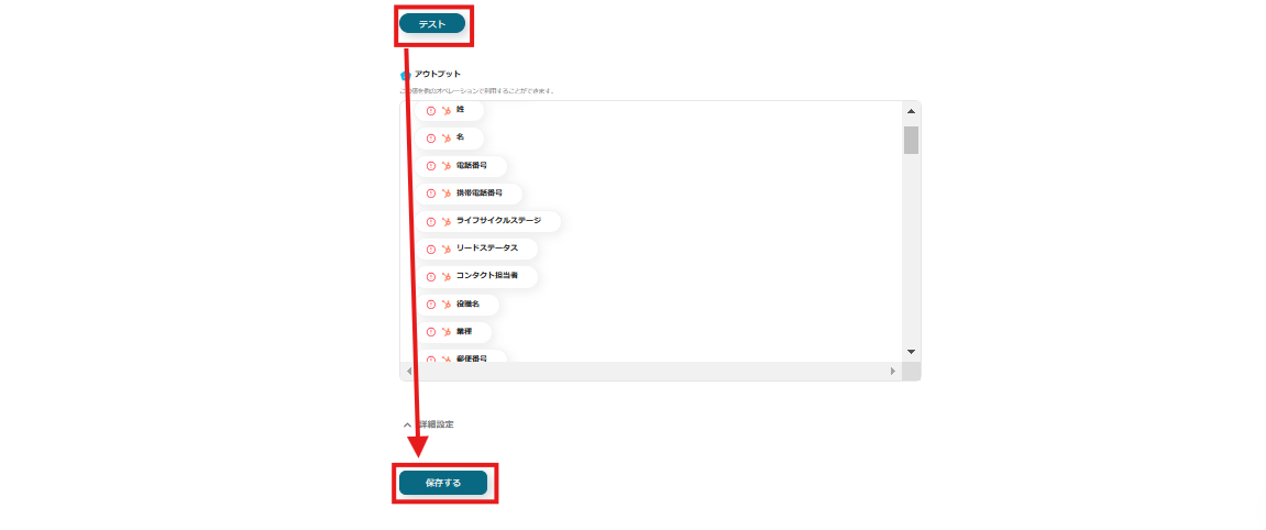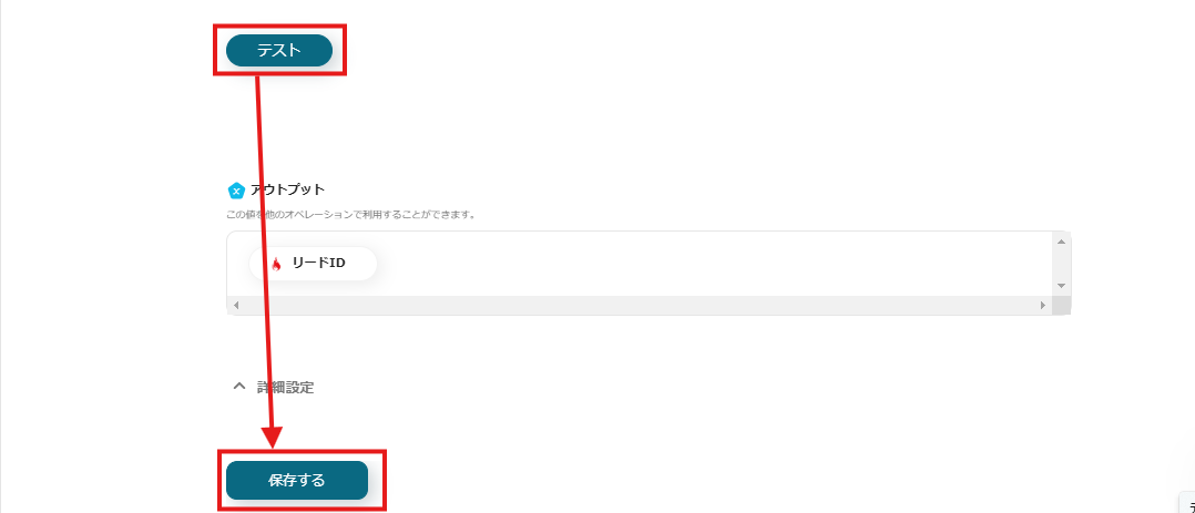設定が完了したら、テストを行いアウトプットが取得されたら「保存する」をクリックしてください。