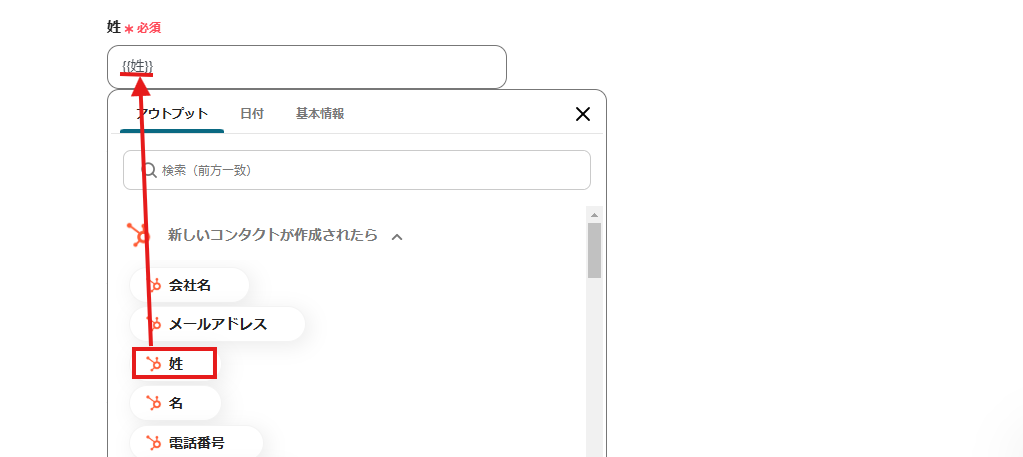 姓を自動取得する方法:枠内をクリックし、新しいコンタクトが作成されたらの中にある「姓」をクリックしてください。