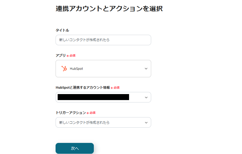 トリガーアクションが「新しいコンタクトが作成されたら」になっているのを確認して「次へ」をクリックしてください。