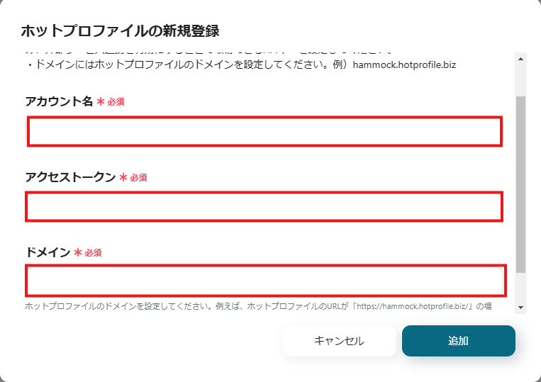 ホットプロファイルの新規登録画面が表示されるので、注釈を参考に上記項目を入力し「追加」をクリックしてください。