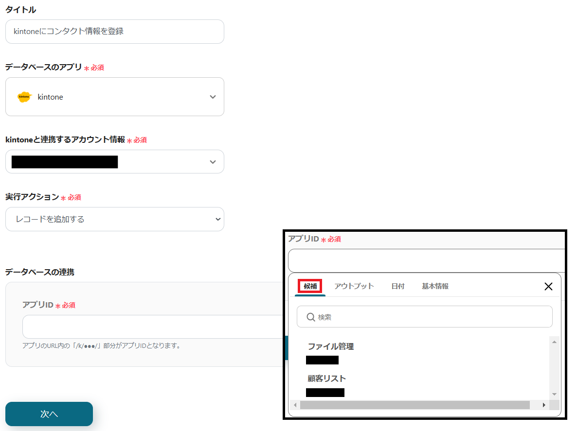 2.kintoneと連携するアカウントを確認して、データベースの連携でアプリIDを設定し、「次へ」をクリックします。