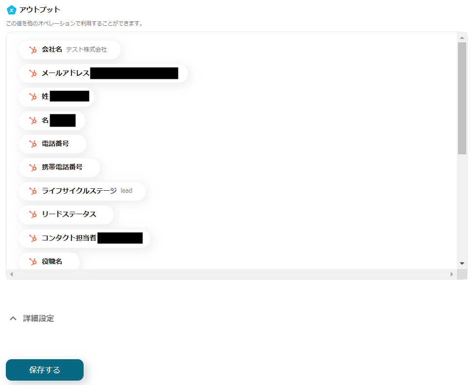 5.テストが成功するとアウトプットにHubSpotから取得した情報が表示されます。