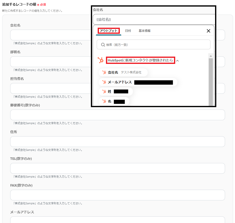 各項目は、枠をクリックして表示されるアウトプットの「HubSpotに新規コンタクトが登録されたら」から選択します。(値は二重括弧で表示されます)