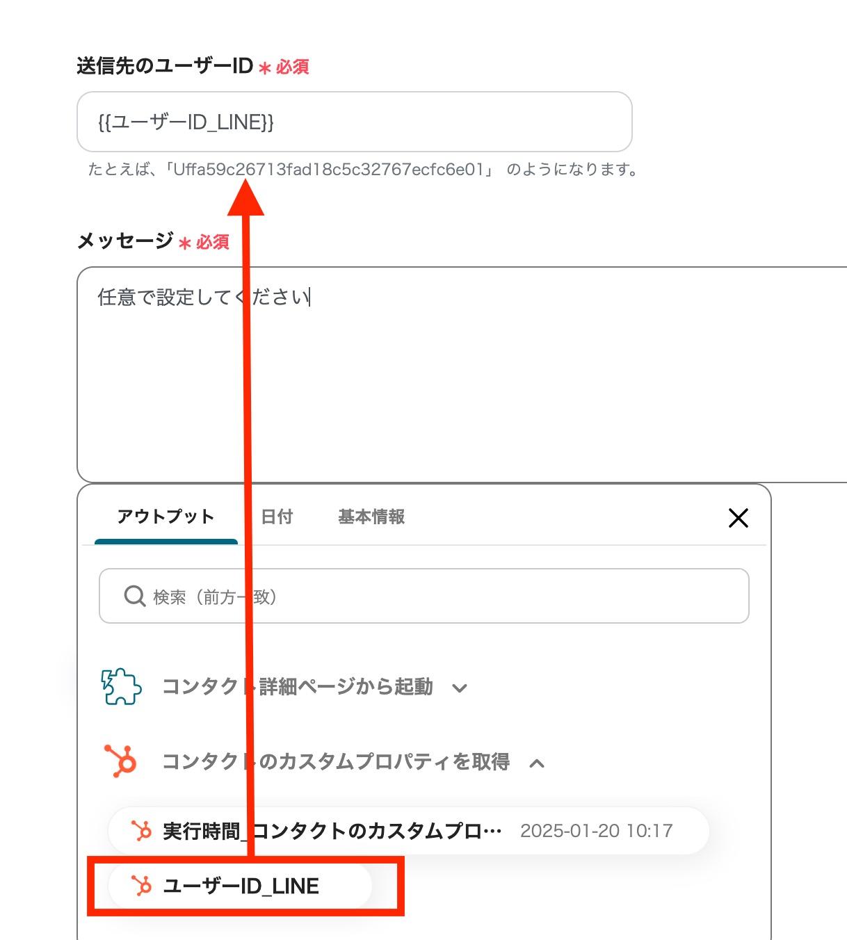 これにより、HubSpotの情報を使って手動でメッセージを送ることも可能ですが、人によって記載情報のばらつきなどが発生するおそれがありますが、この連携によってユーザーへのメッセージ送信までのプロセスを標準化することができます。